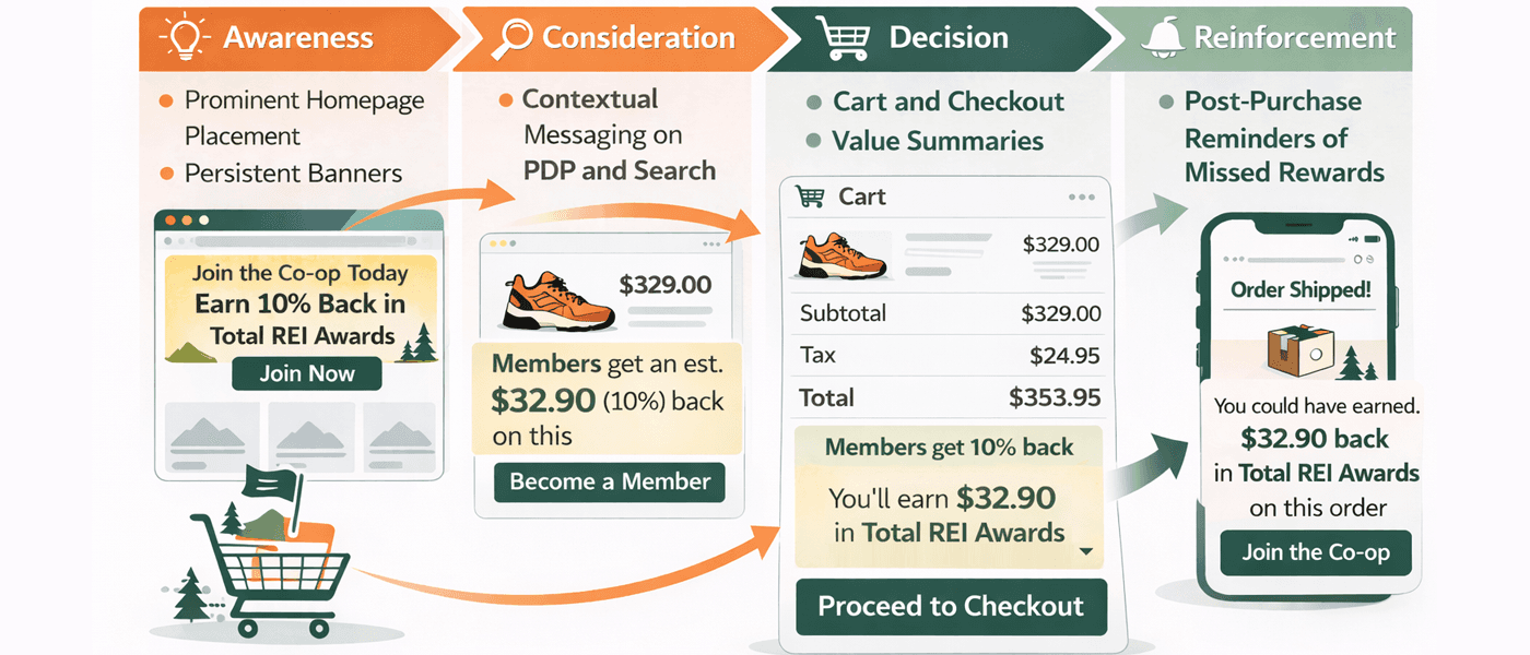 Online, REI’s membership wasn’t converting at the level its value justified. Digital acquisition lagged retail by roughly 30%, despite strong traffic and clear purchase intent — a signal that the problem wasn’t awareness, but hesitation at the moment of decision.